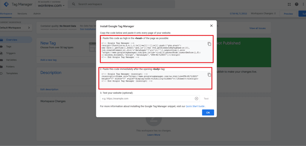 Copy the GTM container code, paste the first snippet in your website’s <head> tag and the second snippet immediately after the <body> tag. Save and publish changes.